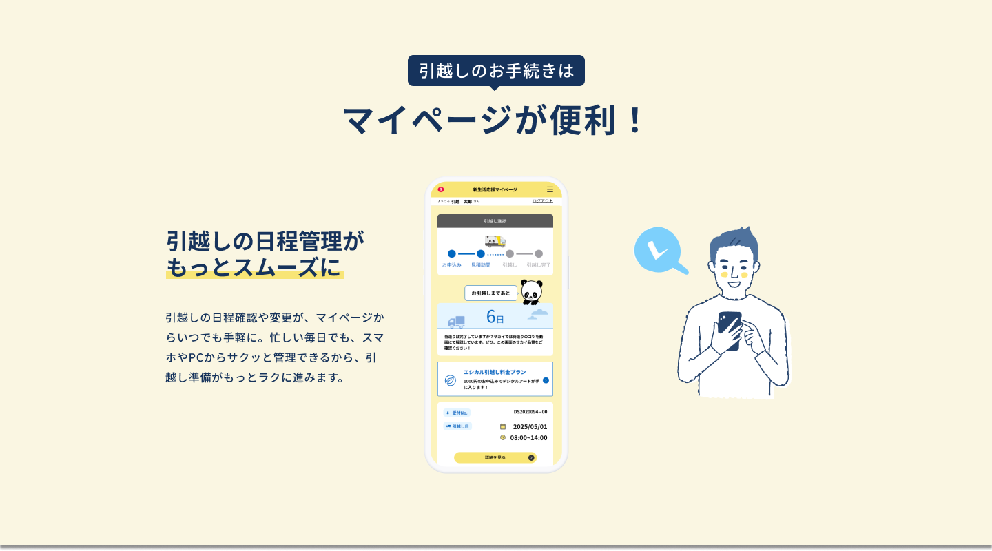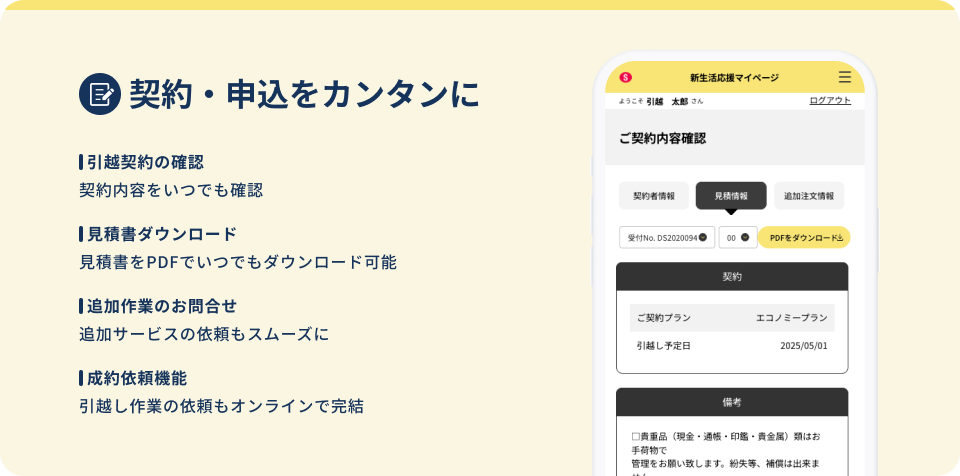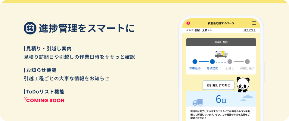 見積もり訪問日や引越し日程の確認、契約内容の閲覧、引越し日の変更依頼、追加作業の問い合わせなどが可能です。また、引越しに関するお知らせや引越しの進捗状況も一目で確認できます。