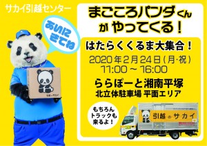 2/24(月・祝)ららぽーと湘南平塚で行われる「はたらくくるま大集合!」に サカイ引越センターCMで頑張っている、まごころパンダくんがお邪魔します!