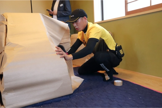 他にも、キルティングを利用し優しく家具を包むワンタッチ梱包も業界初の実績です。ゴミを出さず、面倒な片づけの手間を省き、より便利に、より安全にそして、スピーディで経済的に。