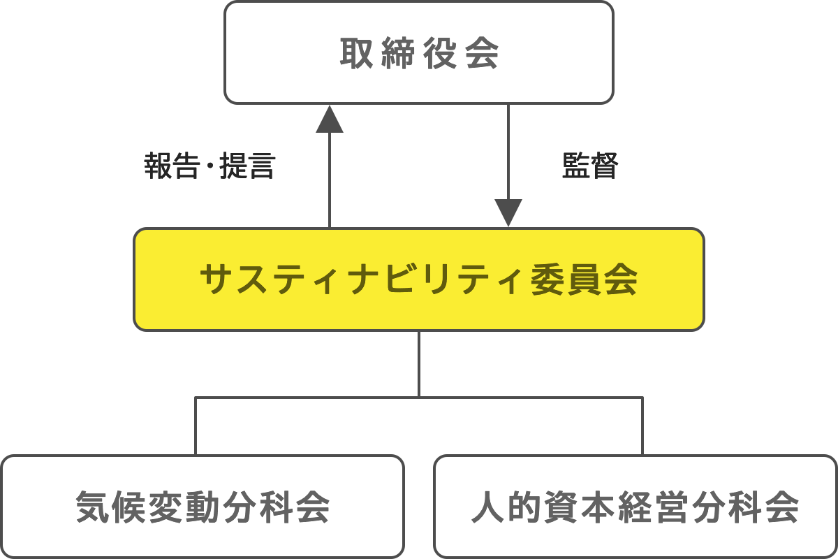 当社はサステナビリティの視点から当社の長期的な発展を見据えた議論を実施するため、サステナビリティに関するガバナンスの強化を目指し、取締役会にサステナビリティに関する事項を報告・提言する機関として「サステナビリティ委員会」を設置しています。